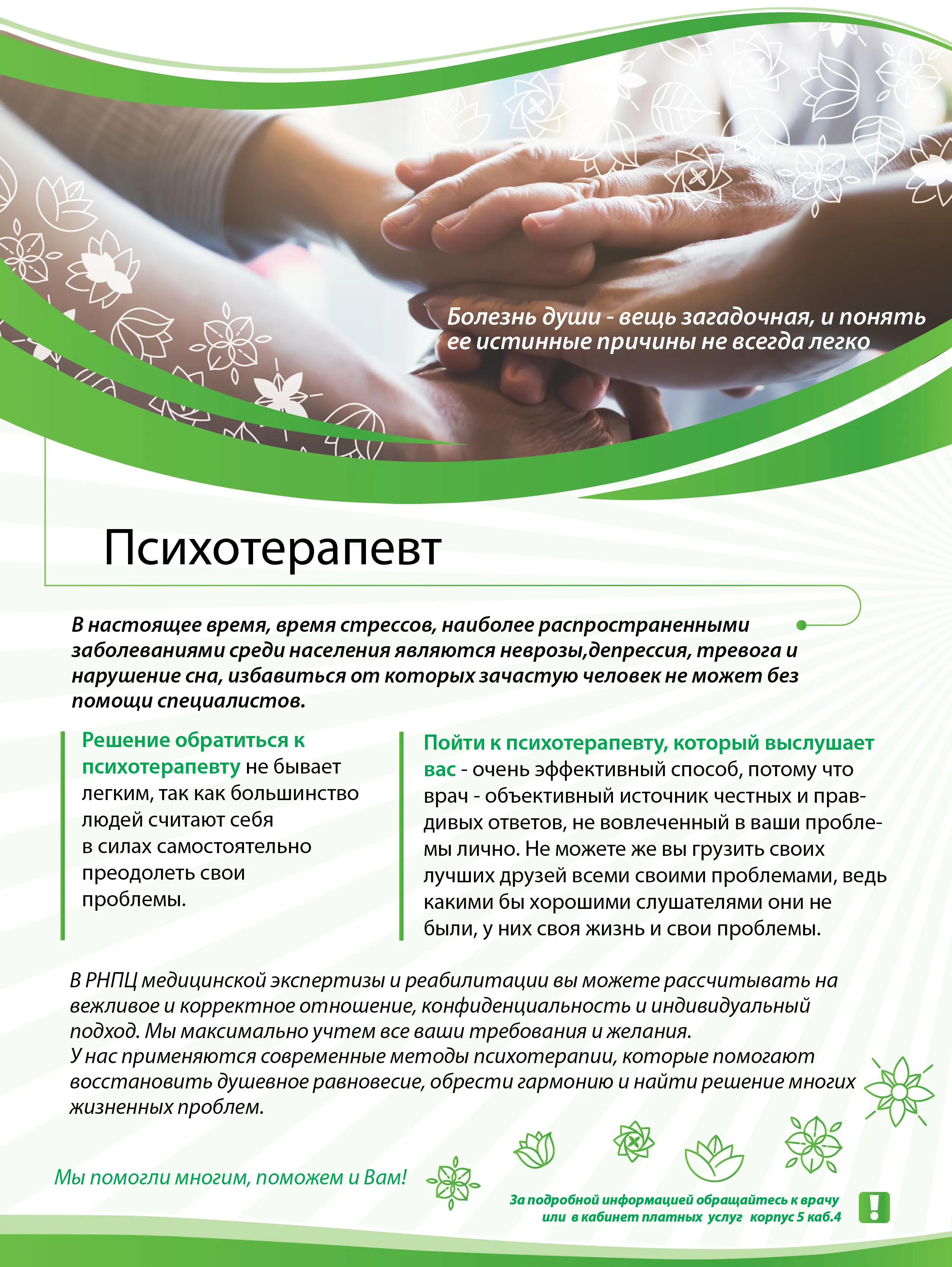 В РНПЦ медицинской экспертизы и реабилитации вы можете рассчитывать на вежливое и корректное отношение, конфиденциальность и индивидуальный подход. Мы максимально учтем все ваши требования и желания. У нас применяются современные методы психотерапии, которые помогают восстановить душевное равновесие, обрести гармонию и найти решение многих жизненных проблем.